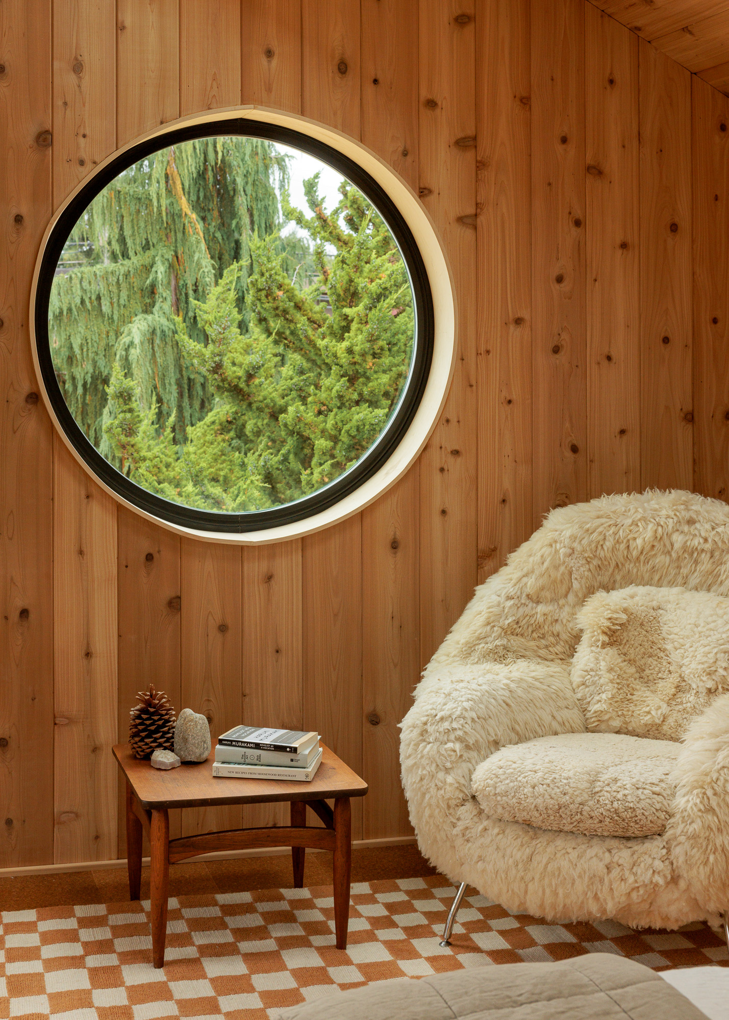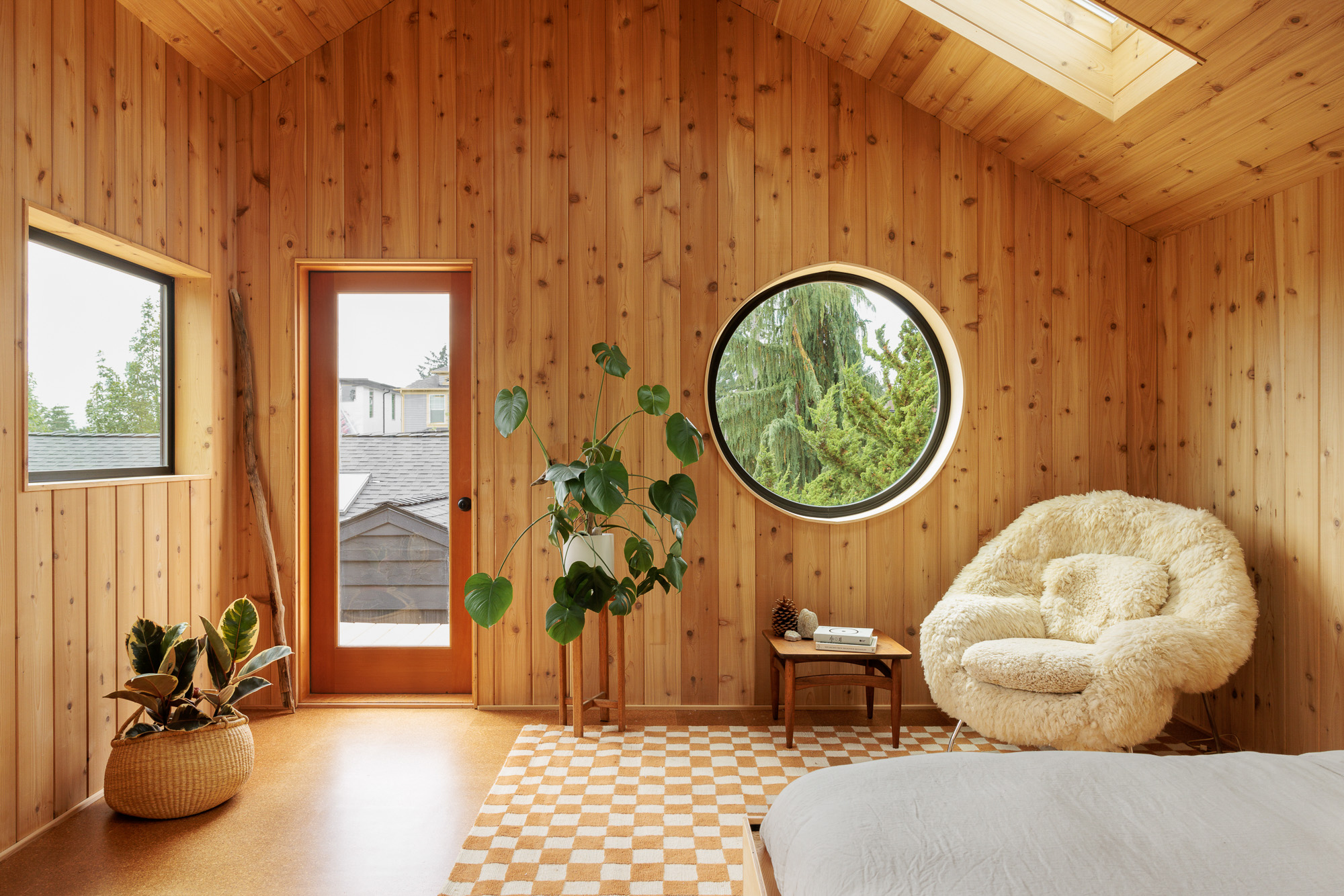 Rooted in wellness, community, and natural materials, the Moonwave DADU was conceived as a healing, grounded space that blends seamlessly with its Seward Park surroundings. The final design is sculptural yet soft, drawing inspiration from southern California coastal architecture and enveloped entirely in untreated cedar to silver naturally with age. Every design move, from the oversized round window to the repurposed cabinetry, was a collaborative effort guided by Autumn’s eye for aesthetics and values of sustainability, non-toxic living, and beauty in simplicity.