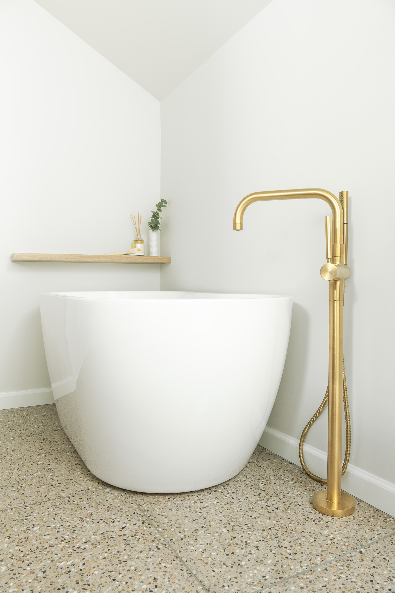 A pre-existing closet was turned into a new kid’s bath. Intended for both a boy and a girl, the design was all about playful colors. Materials like terrazzo and patterned tile as well as brightly colors cabinetry brought in a lot of fun while also creating a space that would grow with the children.