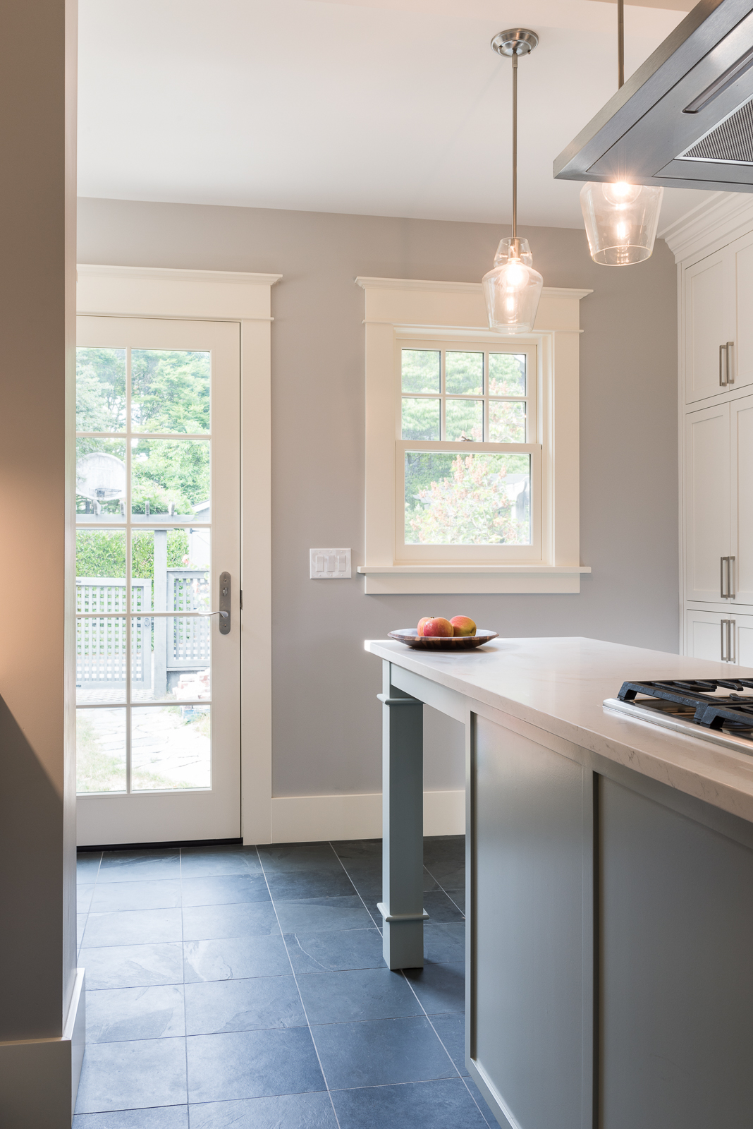 Finishes include elegant slate tile flooring, stone countertops and white subway tile walls. Custom cabinetry enhances the traditional style with elegant flush drawers. Decorative molding around windows, doors and cabinets ceiling complete the look. An area at the back door for a seating bench with places to hang jackets and place shoes adds to the functional elegance of the space.