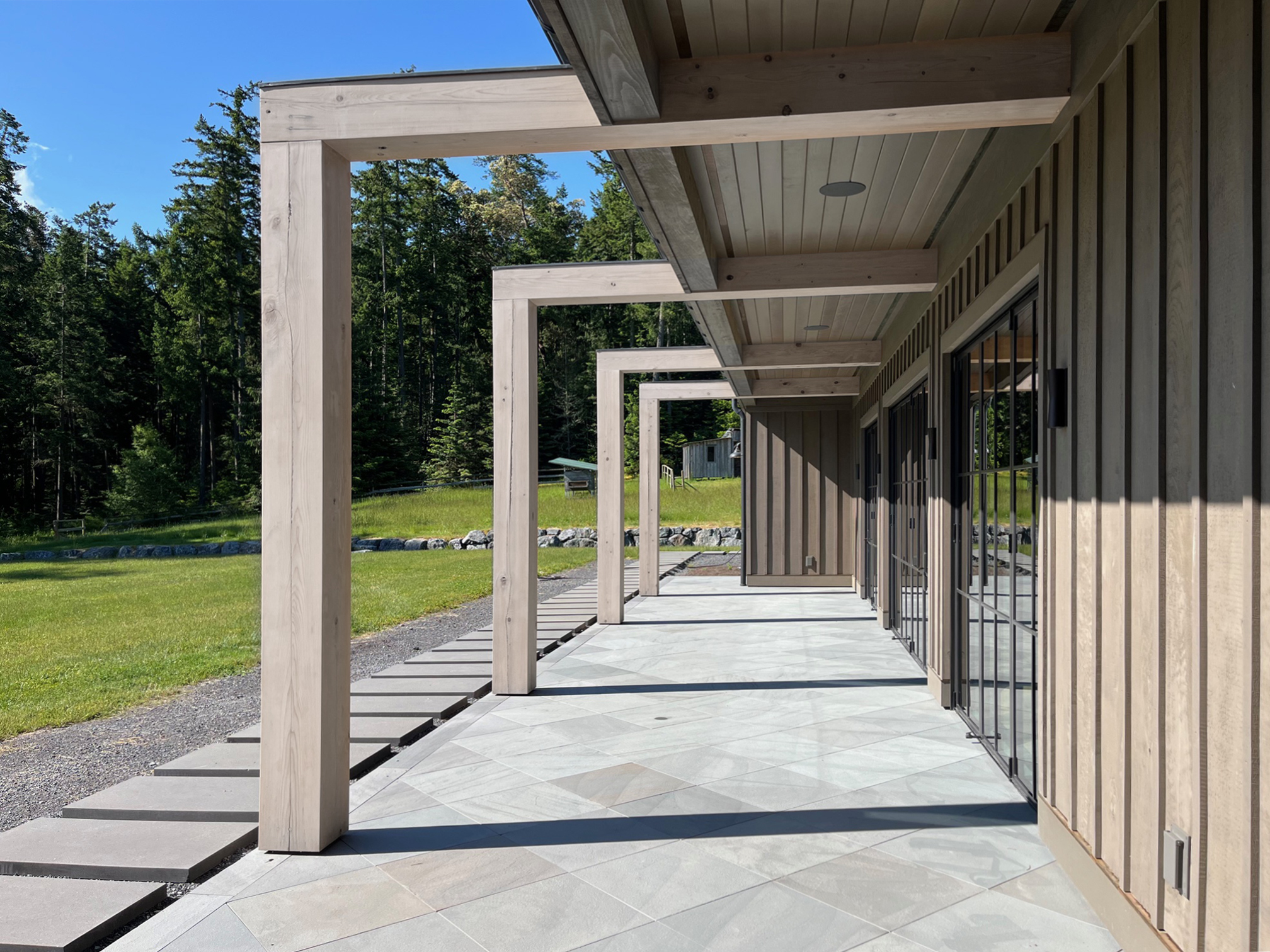 The design centers around a striking view axis that runsthrough the heart of the home, framed by mature Douglas fir trees. From thisanchor point, the house extends into three distinct wings. A central gatheringspace includes expansive indoor and outdoor living areas. One wing offersaccommodations for visiting friends and family, while the other serves as amore private retreat for the owners. These wings can function independently orcome together as a cohesive whole, offering flexibility for different seasonsof life.