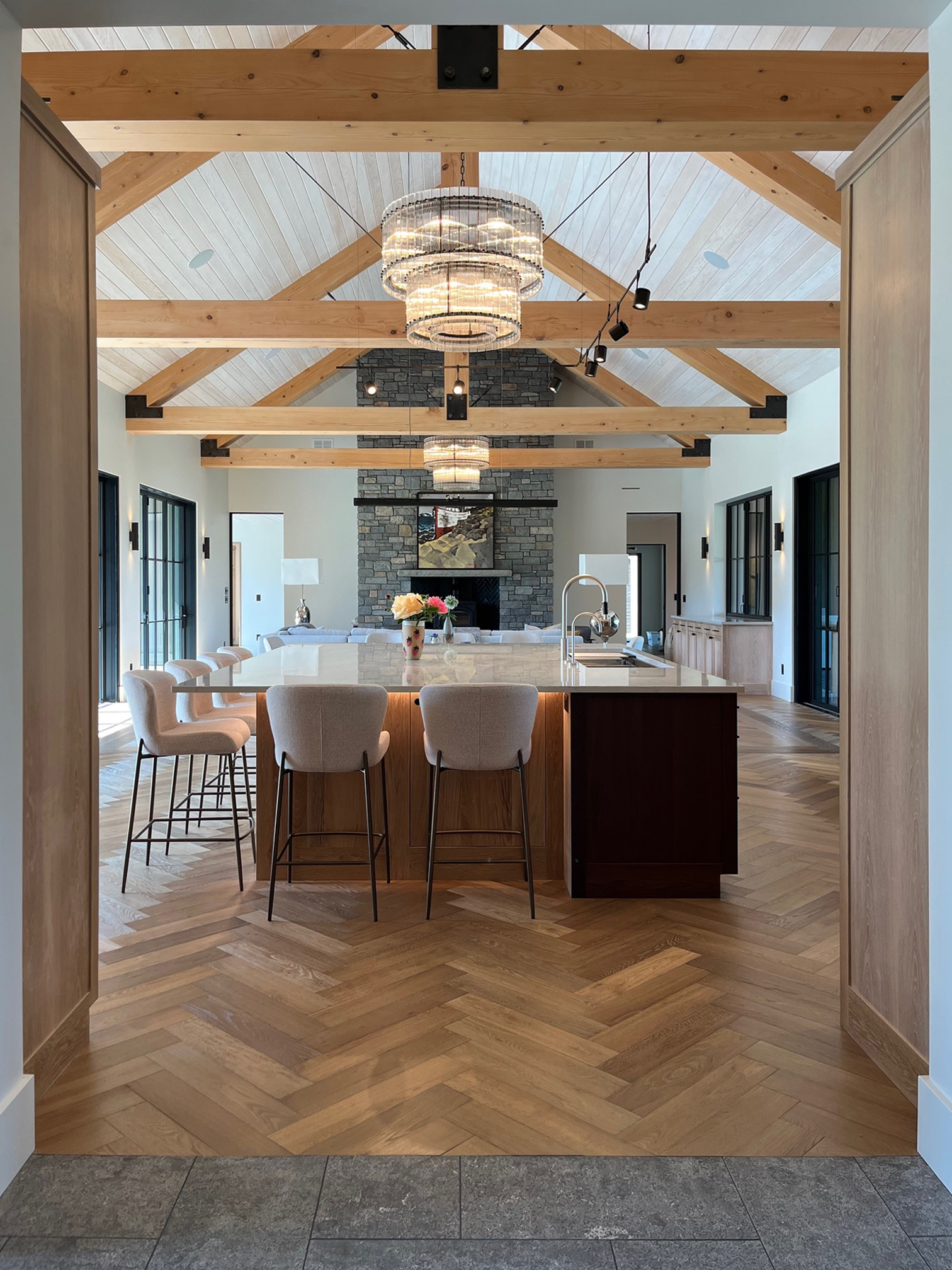 Material selections emphasize regional character andenduring beauty. Locally sourced cedar is used throughout for siding and timberframing. Columbia River basalt grounds the home in the geology of the PacificNorthwest, reinforcing a strong sense of place and permanence.